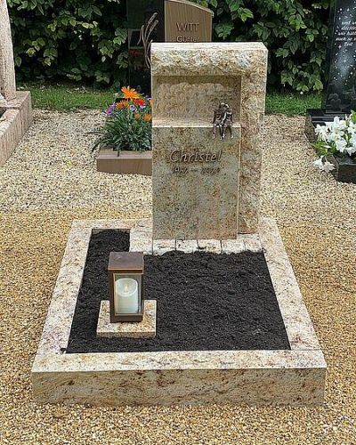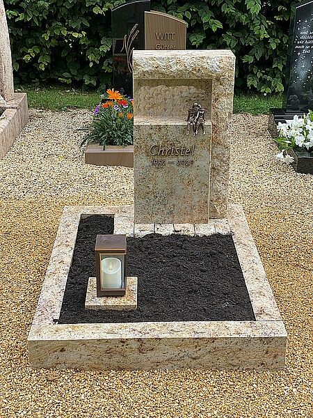 Ob als liegender Stein wie Kissen, Buch oder Platte – häufig ergänzt mit schlichter Einfassung – oder als kleine, zum Format passende Stele: Jedes Urnengrab erhalten Sie von uns als maßgefertigte, liebevolle Erinnerung, die stille Würde und Persönlichkeit verbindet.